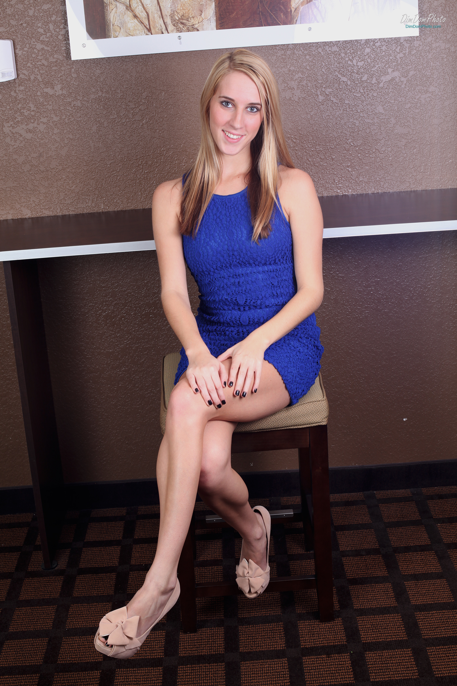 Description: Kerri goes from black stockings to cute blue sun dress, showing her shapely legs. |